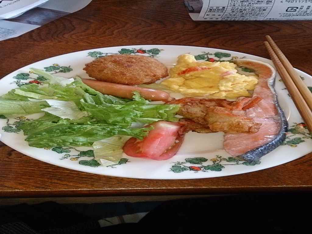 朝食時間に全員集合で朝ごはんなわけですが、朝食メニューはいたってシンプルにライトなスクランブル、ハム、鮭、野菜とまぁなんでもありーな感じの田舎ご飯でした。食べる場所が昨夜の居間というか8畳程の部屋で、宿泊人全員集合で朝食するにはキツキツでした。隣との隙間ははわずかに5cm未満です。正直いうとオーナーには悪いが、客層悪すぎです。あさっぱらからあつくるしすぎ。目の前には贅肉野郎(超イビキうるさかったやつ)となりにはやたらに喋り捲るジイ様、斜め向かいには朝からきょどってるヤツいるし、憂鬱な朝に逆感動。こんな酷さめったに味わえない。まるでテルマエ・ロマエの主人公が、湯にドボンして、初めて、平たい顔族を目にした時のようなショックを私は受けている。どうそろえたらここまで異質な平たい顔族があつまるのだろうか・・・